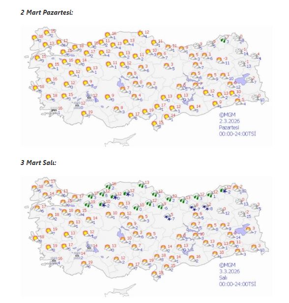 Pazartesi günü de ülke genelinde düşük sıcaklıkların etkisini sürdürmesi bekleniyor. Doğu ve kuzeydoğu bölgelerde hava sıcaklıklarının -2 ile 4 derece arasında olacağı tahmin edilirken, yüksek kesimlerde kar ihtimalinin devam edeceği bildirildi. Batı bölgelerde ise sıcaklıkların hafif artış göstereceği öngörülüyor.