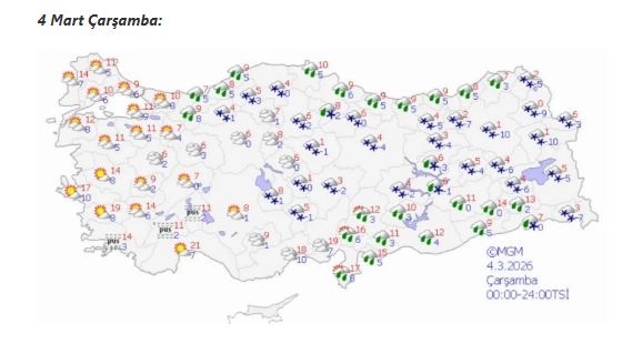 Bugün İç Anadolu, Karadeniz’in iç kesimleri, Doğu Anadolu ile Güneydoğu Anadolu’nun kuzeyinde kar yağışı bekleniyor. Marmara ve Ege bölgelerinde ise parçalı bulutlu bir gökyüzü öngörülüyor.