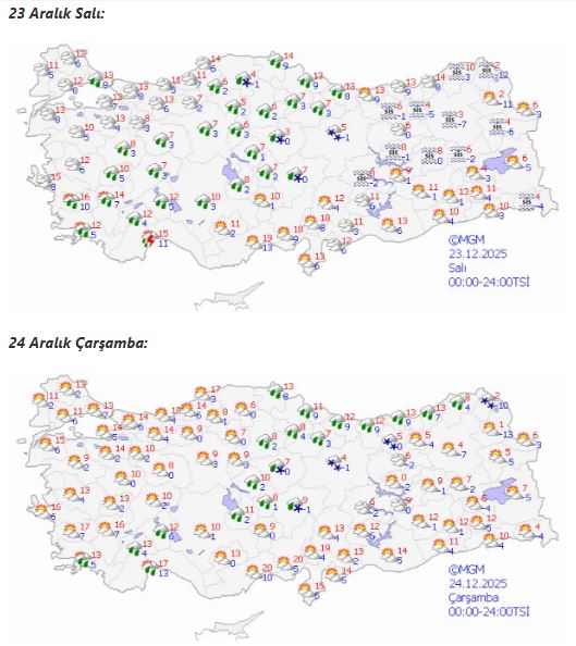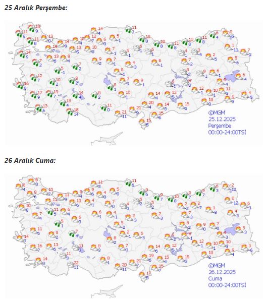 Bugün ülke genelinde parçalı ve çok bulutlu bir hava hâkim olacak. Batı bölgelerde aralıklı yağmur ve sağanak yağışlar görülürken, kıyı kesimlerde sıcaklıkların 12-18 derece, iç kesimlerde ise 8-13 derece civarında seyretmesi bekleniyor. Doğu Anadolu’da gece sıcaklıklarının sıfırın altına düşmesiyle birlikte don ve buzlanma riski artacak.