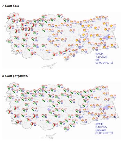 Çarşamba günü ise kuzey, iç ve batı bölgelerde parçalı çok bulutlu hava bekleniyor. Marmara, Ege, Batı Akdeniz, İç Anadolu’nun kuzeybatısı, Karadeniz kıyıları ile Adana, Osmaniye ve Konya civarında sağanak yağışların görüleceği açıklandı. Diğer bölgelerde parçalı bulutlu hava etkili olurken, sıcaklıklar 18-25 derece arasında seyredecek.