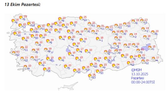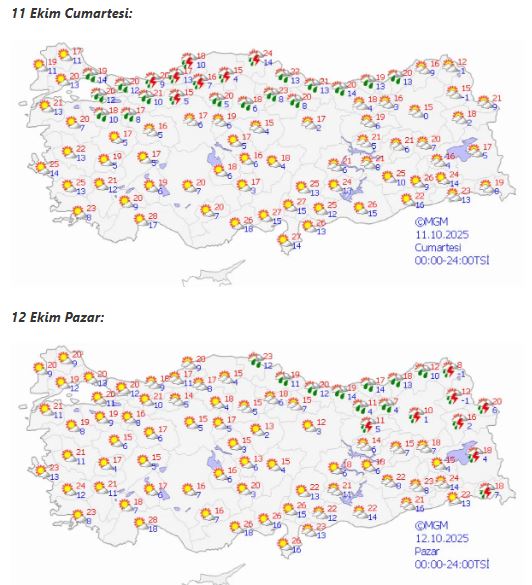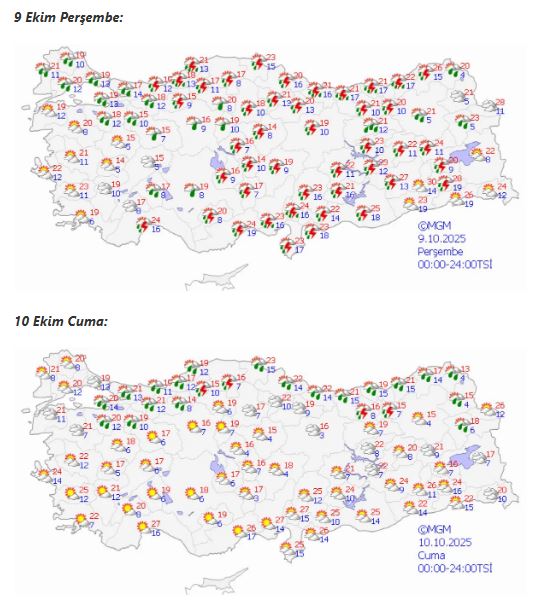 MGM verilerine göre yurt genelinin parçalı ve çok bulutlu geçeceği, Marmara’nın kuzey ve doğusu, Akdeniz, İç Anadolu, Karadeniz, Doğu Anadolu’nun kuzey ve batısı, Güneydoğu Anadolu’nun batısı ile Çanakkale, Kütahya, Bitlis ve Van çevrelerinde sağanak ve yer yer gök gürültülü yağışların etkili olacağı tahmin ediliyor.