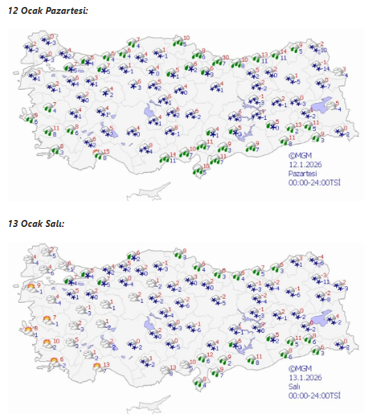 Salı ve çarşamba günleri kar yağışının bazı bölgelerde azalması beklenirken, soğuk havanın etkisini sürdürmesi öngörülüyor. Özellikle iç ve doğu bölgelerde buzlanma, don ve tipi riskine karşı vatandaşların dikkatli ve tedbirli olması isteniyor.