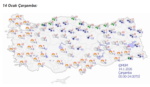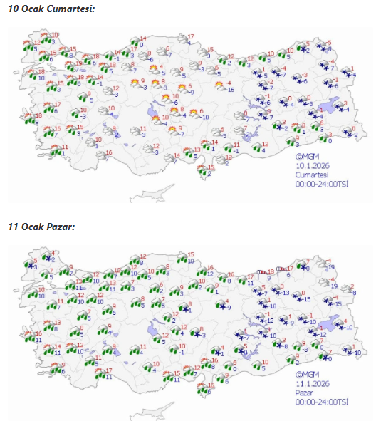Pazar günü itibarıyla yağışların ülke genelinde artması bekleniyor. Karadeniz, İç Anadolu, Doğu Anadolu ve yüksek rakımlı bölgelerde yoğun kar yağışı öngörülüyor. Sıcaklıkların birçok ilde -5 ile 5 derece aralığına kadar düşeceği tahmin edilirken, doğu kesimlerde yer yer -10 dereceye varan soğuklar bekleniyor.