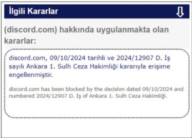 Ankara Cumhuriyet Başsavcılığının talebi üzerine Ankara 1. Sulh Ceza Hakimliği’nce Discord isimli sosyal medya platformuna 5651 Sayılı ‘İnternet Ortamında Yapılan Yayınların Düzenlenmesi ve Bu Yayınlar Yoluyla İşlenen Suçlarla Mücadele Edilmesi Hakkında Kanun’un 8/1 maddesinde yer alan “çocukların cinsel istismarı ve müstehcenlik” suçlarının işlendiğine dair yeterli şüphenin bulunması nedeniyle tüm yayınlarının içerikten çıkartılarak belirtilen URL adreslerine Türkiye’den erişimin engellenmesi kararı verilmiştir.