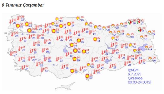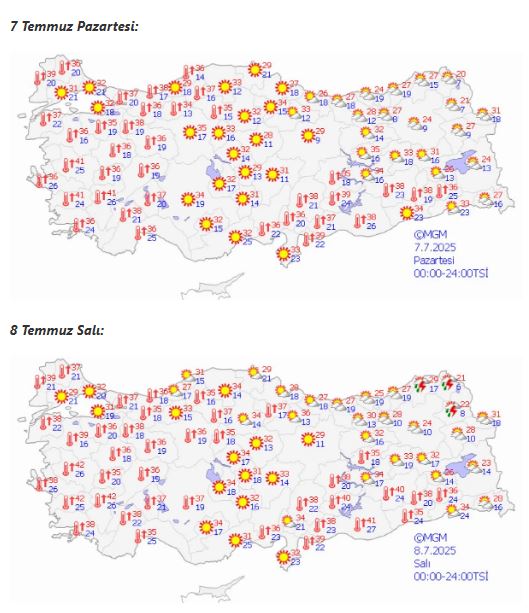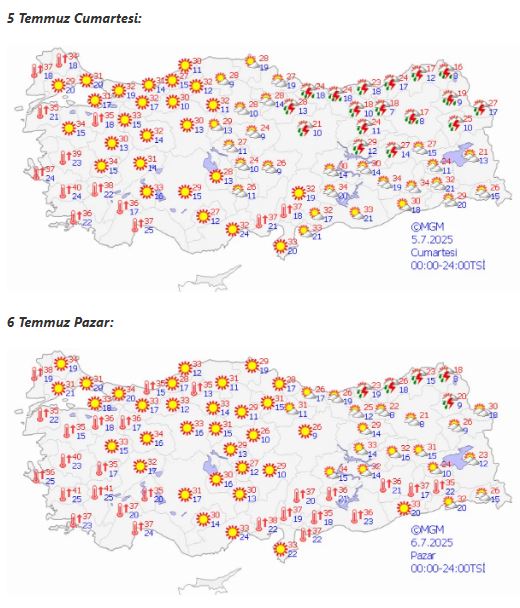 Meteoroloji Genel Müdürlüğü (MGM), 5-12 Temmuz 2025 tarihleri arasında yurt genelinde mevsim normallerinin 4 ila 6 derece üzerinde seyredecek aşırı sıcak hava dalgası için uyarıda bulundu. Özellikle batı ve iç kesimlerde sıcaklıkların rekor seviyelere ulaşması bekleniyor.