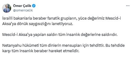 AK Parti Sözcüsü Ömer Çelik de sosyal medya hesabından yaptığı açıklamada Ben-Gvir’in eylemini lanetleyerek şu ifadeleri kullandı: