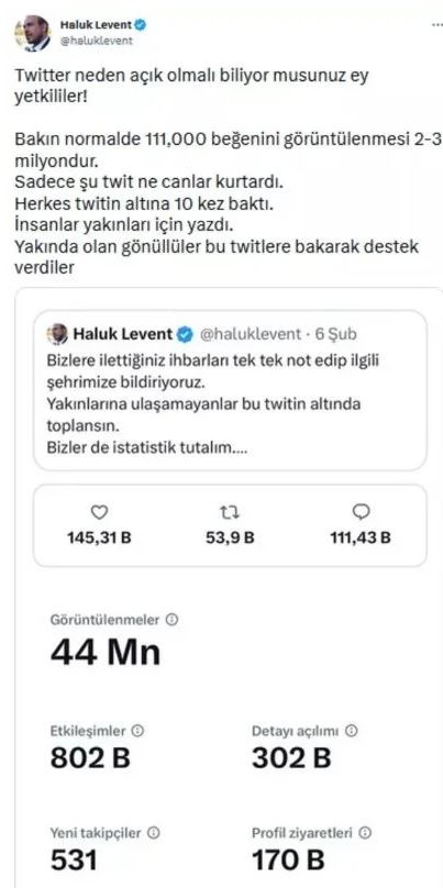 Haluk Levent Twitter'daki "Bizlere ilettiğiniz ihbarları tek tek not edip ilgili şehirlerimize bildiriyoruz. Yakınlarına ulaşamayanlar bu twitin altında toplansın. Bizler de istatistik tutalım" paylaşımının etkileşim sayısını paylaştı. Levent paylaşımında şu ifadeleri kullandı: