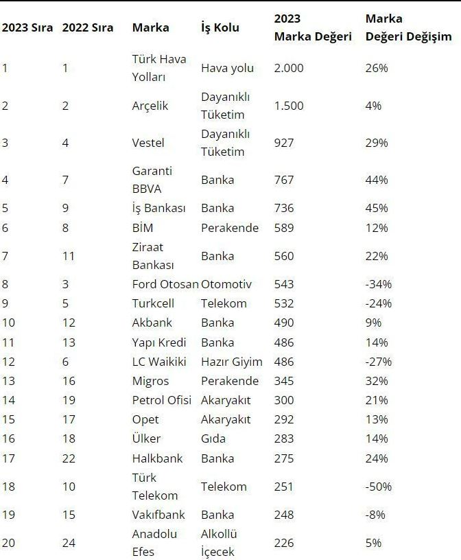 Listede ilk sırayı 2 milyar dolarlık marka değeriyle 2019, 2020, 2021 ve 2022 yıllarında olduğu gibi THY aldı.