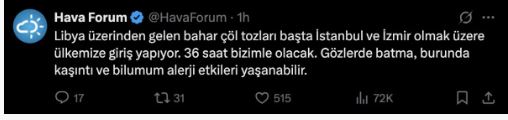 Meteoroloji kaynaklarından Hava Forum, sosyal medya platformu X üzerinden yaptığı açıklamada, Libya üzerinden ülkemize yönelen toz bulutlarına dikkat çekti. Paylaşımda, “Libya üzerinden gelen bahar çöl tozları başta İstanbul ve İzmir olmak üzere ülkemize giriş yapıyor. 36 saat bizimle olacak. Gözlerde batma, burunda kaşıntı ve bilumum alerji etkileri yaşanabilir” ifadelerine yer verildi.