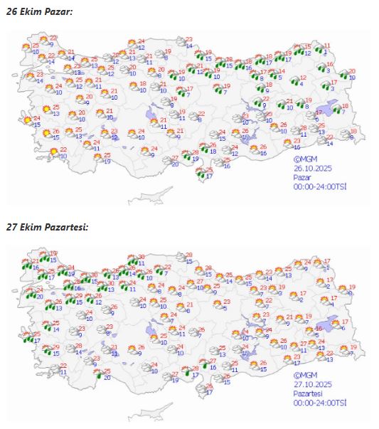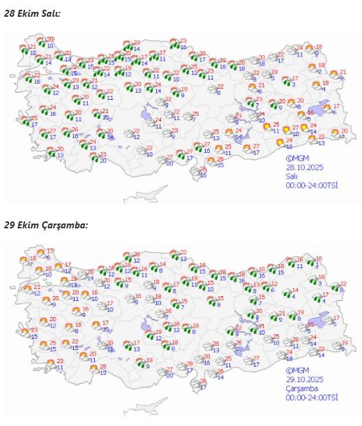 29 Ekim öncesindeki Çarşamba günü hava iyiden iyiye ılımanlaşacak. İstanbul’da sıcaklık 24 dereceye ulaşırken, İzmir 26, Antalya 32 dereceyi görecek. Ankara 20 dereceyle mevsim normallerinin üzerine çıkacak. Marmara’da akşam saatlerinde hafif sağanak ihtimali dikkat çekiyor.