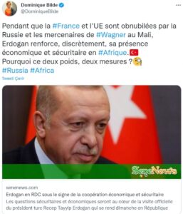 Türkiye'nin kıtadaki başarısına kimsenin neden ses çıkaramadığını eleştiren Fransız vekil, sosyal medya hesabından Erdoğan'ın ziyaretine ilişkin bir haberi alıntılayarak “AB ve Fransa, Mali’deki Rusya ve Wagner’in paralı askerlerine takıntılıyken, Erdoğan Afrika’daki ekonomik ve güvenlik varlığını gizlice güçlendiriyor. Bu çifte standart neden?” ifadelerini kullandı.