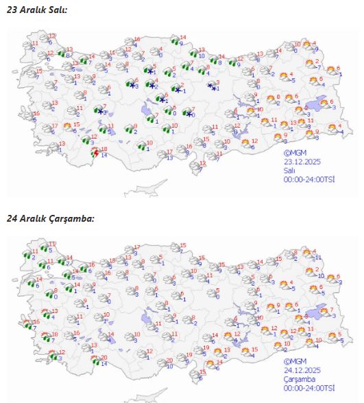 Çarşamba günüyle birlikte sıcaklıkların daha da azalacağı, iç kesimlerde gündüz saatlerinde bile 0-5 derece civarında seyredeceği, doğu bölgelerde ise eksi değerlerin görülebileceği tahmin ediliyor. Kar yağışı ve don olaylarının artması beklenirken, kıyı illerde yağmur geçişleri yaşanabilir.