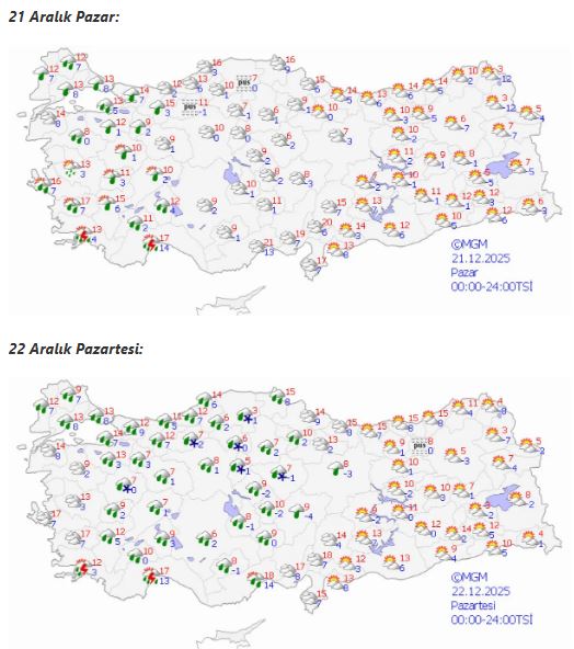 22 Aralık Pazartesi günü itibarıyla sıcaklıklarda belirgin bir düşüş yaşanacak. İç kesimlerde hava sıcaklıklarının 5-10 dereceye, Doğu Anadolu’da ise 0-5 dereceye kadar gerilemesi bekleniyor. Karadeniz’in iç kesimleri ile Doğu Anadolu’da kar yağışı etkili olacak. Kıyı bölgelerde sıcaklıklar görece yüksek kalsa da gece saatlerinde don riski bulunuyor.