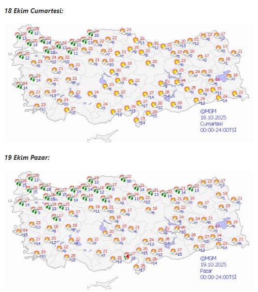 19 Ekim Pazar günü ise parçalı bulutlu bir hava hakim olacak. Kuzeydoğu kesimlerde hafif yağışlar görülebilirken, sıcaklıklar 21-27 dereceye kadar çıkacak.