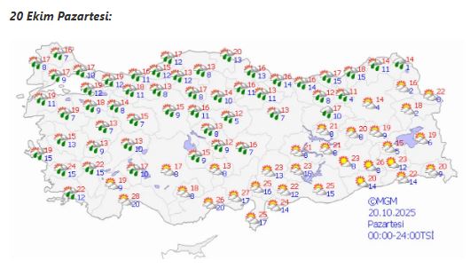 20 Ekim Pazartesi günü güneşli hava ülke genelinde etkisini artıracak. Ancak Karadeniz kıyılarında yerel yağışların sürmesi bekleniyor. Sıcaklıklar 22-28 derece aralığında olacak; güney kesimlerde ise 30 dereceye yaklaşacak.