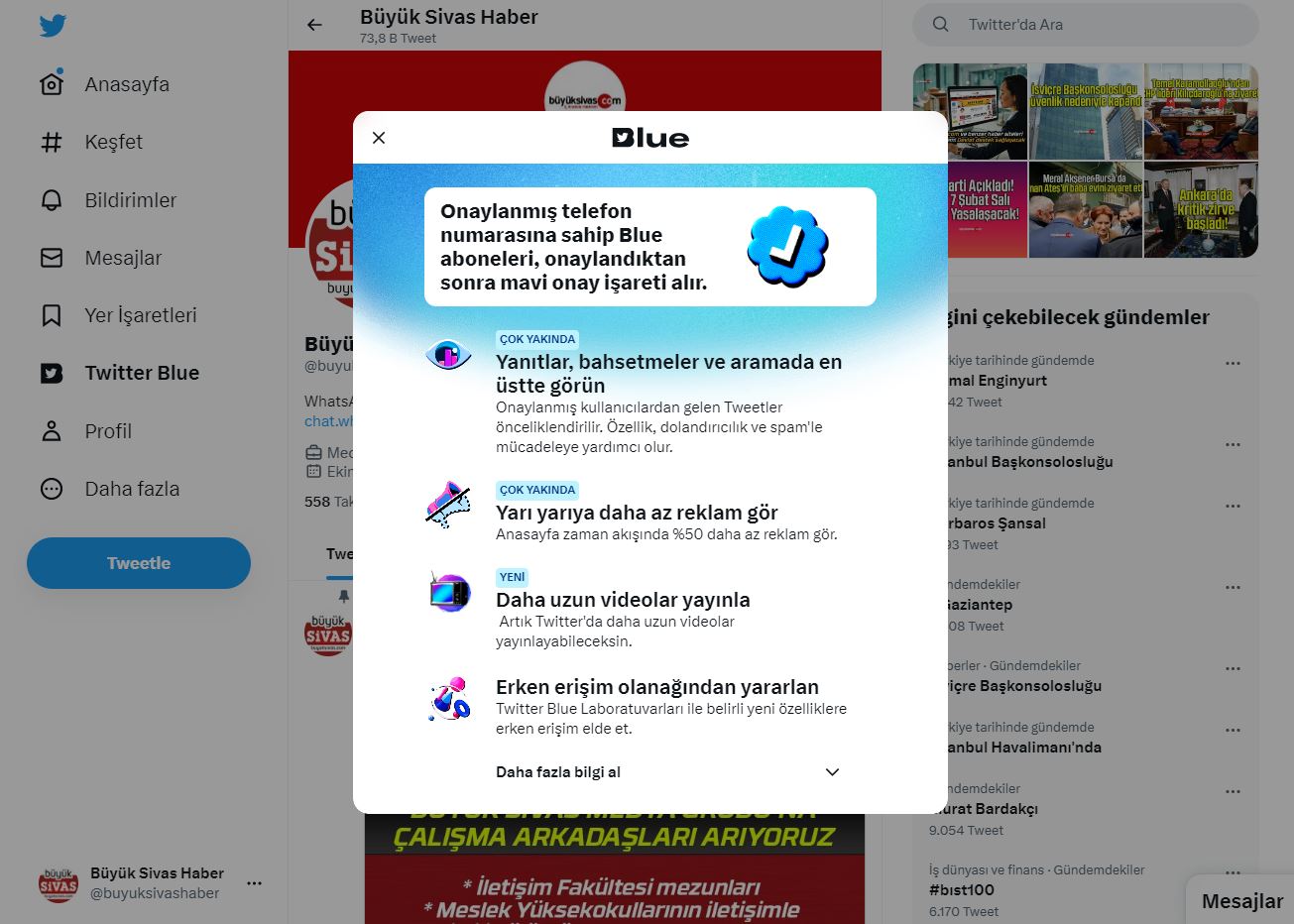 Şimdiye kadar Twitter Blue aboneliği Türkiye'de gözükmüyor veya satın alınamıyordu. Ancak kısa bir süre önce Twitter'ın ana sayfasında Blue sekmesi eklenmiş olarak ortaya çıktı. Dolayısıyla özellik çok yakında Türkiye'de kullanıma sunulacak gibi görünüyor.
