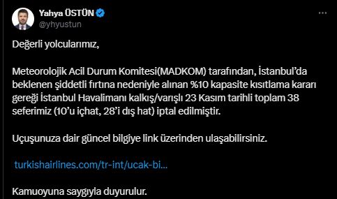 THY Basın Müşaviri Yahya Üstün, sosyal medya hesabından yaptığı paylaşımda, "Değerli yolcularımız, Meteorolojik Acil Durum Komitesi (MADKOM) tarafından, İstanbul'da beklenen şiddetli fırtına nedeniyle alınan yüzde 10 kapasite kısıtlama kararı gereği İstanbul Havalimanı kalkış/varışlı 23 Kasım tarihli toplam 38 seferimiz (10'u iç hat, 28'i dış hat) iptal edilmiştir" ifadelerine yer verdi.