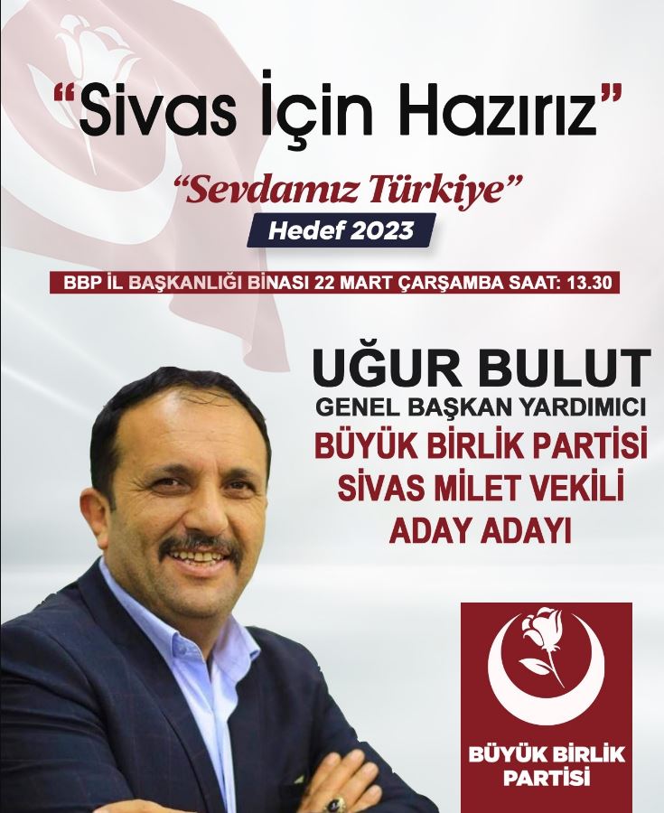 Genel Başkan Yardımcısı Uğur Bulut sosyal medya hesabından yaptığı açıklamada: " Saygıdeğer hemşehrilerim Kıymetli gönüldaşlarım 22 Mart Çarşamba günü Partimizin Sivas İl Başkanlığı binasında saat 13 30'da Milletvekilliği Aday Adaylığı başvurumu yapacağım Kadirşinas hemşehrilerimi ve vefakâr gönüldaşlarımı davet ediyorum