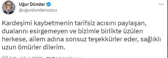 "Uzun süredir hasta olan kız kardeşim Gülten'i kaybettik. Acımız büyük. Allah rahmet eylesin, mekânı cennet olsun. Dualarını esirgemeyen dostlar sağolsun."