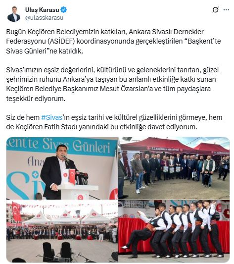 “Bugün Keçiören Belediyemizin katkıları, Ankara Sivaslı Dernekler Federasyonu (ASİDEF) koordinasyonunda gerçekleştirilen ‘Başkent’te Sivas Günleri’ne katıldık. Sivas’ımızın eşsiz değerlerini, kültürünü ve geleneklerini tanıtan, güzel şehrimizin ruhunu Ankara’ya taşıyan bu anlamlı etkinliğe katkı sunan Keçiören Belediye Başkanımız Mesut Özarslan’a ve tüm paydaşlara teşekkür ediyorum. Siz de hem Sivas’ın eşsiz tarihi ve kültürel güzelliklerini görmeye, hem de Keçiören Fatih Stadı yanındaki bu etkinliğe davet ediyorum.”