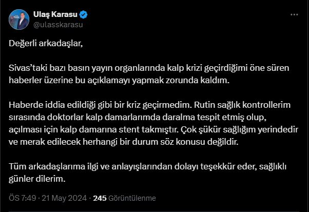 CHP Sivas Milletvekili Ulaş Karasu sosyal medya hesabından sağlık durumuyla ilgili açıklama yaptı.