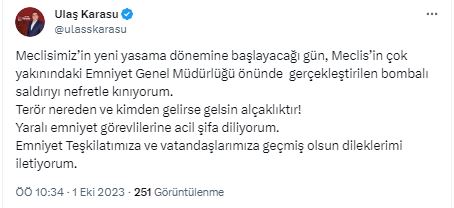 "Meclisimiz’in yeni yasama dönemine başlayacağı gün, Meclis’in çok yakınındaki Emniyet Genel Müdürlüğü önünde gerçekleştirilen bombalı saldırıyı nefretle kınıyorum.
