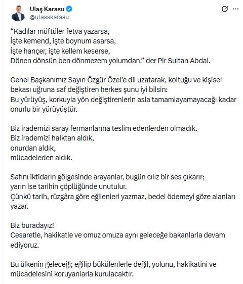 Ulaş Karasu, açıklamasında Pir Sultan Abdal’ın dizelerine yer vererek CHP Genel Başkanı Özgür Özel’e yönelik eleştirilere yanıt verdi. Karasu, siyasi duruşlarının halkın iradesine dayandığını vurgulayarak, partinin mücadelesinden geri adım atmayacaklarını ifade etti.
