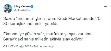 Ekonomiye güven sıfır, mutfakta yangın var ama Saray'daki şahıs milletin aklıyla alay ediyor." ifadelerine yer verdi.