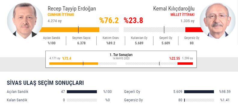İşte 28 Mayıs 2023 Cumhurbaşkanlığı Seçimlerinde Ulaş ilçesinden gelen sonuçlar: (Devrim Esra Dündar)