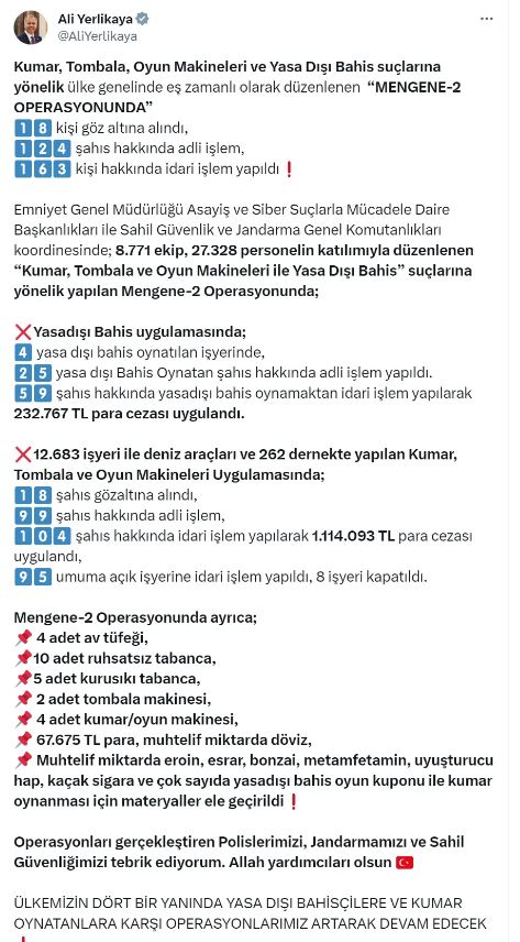 İçişleri Bakanı Ali Yerlikaya ülke genelinde yasa dışı bahis operasyonunda 18 kişinin gözaltına alındığını açıkladı. Yerlikaya 124 şahıs hakkında adli işlem, 163 kişi hakkında da idari işlem yapıldığını bildirdi.