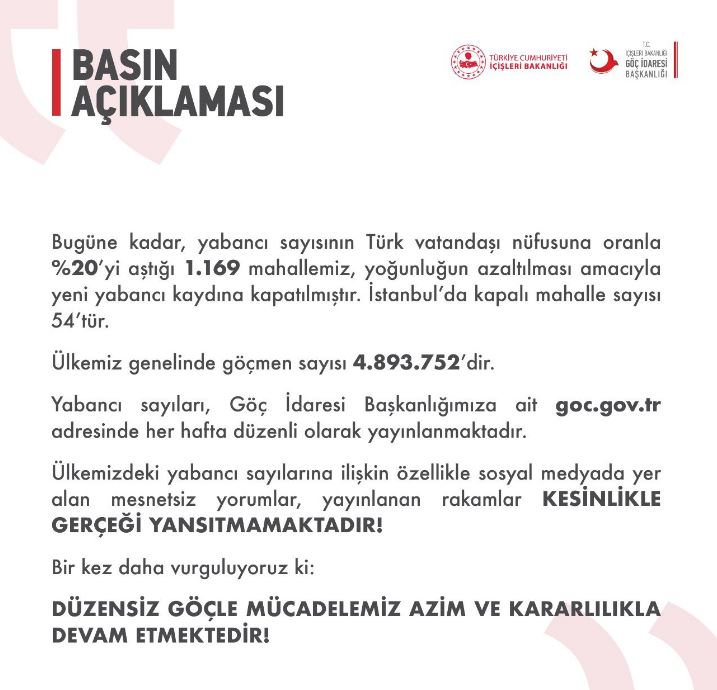İçişleri Bakanlığı Göç İdaresi Başkanlığının resmi Twitter hesabından yaptığı paylaşımda, “İçişleri Bakanlığı Göç İdaresi Başkanlığı, bugüne kadar, yabancı sayısının Türk vatandaşı nüfusuna oranla yüzde 20’yi aştığı bin 169 mahallemiz, yoğunluğun azaltılması amacıyla yeni yabancı kaydına kapatılmıştır.