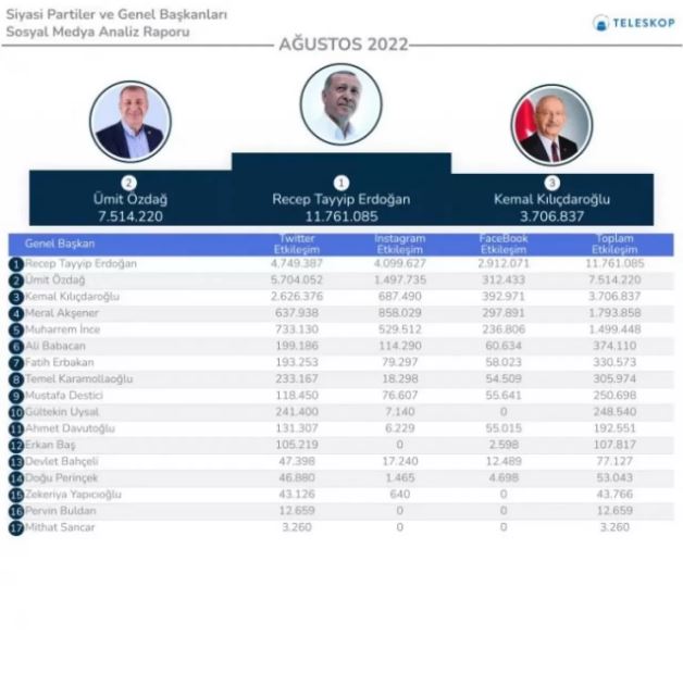 Raporda siyasi parti liderlerinin Twitter, İnstagram, Facebook, etkileşimleri yer aldı. Ağustos 2022 Teleskop APP raporuna göre Cumhurbaşkanı Erdoğan, üç sosyal medya platformunda da en fazla etkileşime sahip lider olarak yer aldı.