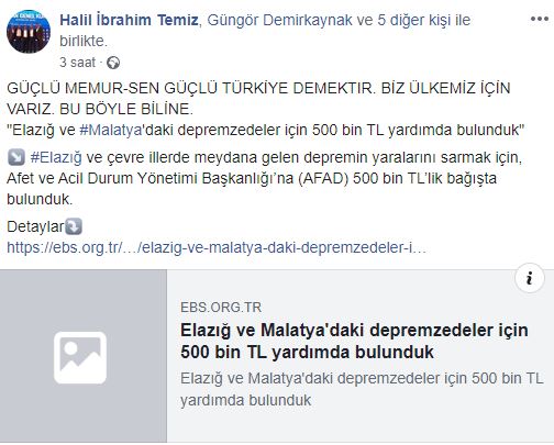 "Elazığ ve #Malatya'daki depremzedeler için 500 bin TL yardımda bulunduk" #Elazığ ve çevre illerde meydana gelen depremin yaralarını sarmak için, Afet ve Acil Durum Yönetimi Başkanlığı’na (AFAD) 500 bin TL’lik bağışta bulunduk." paylaşımını yaptı.