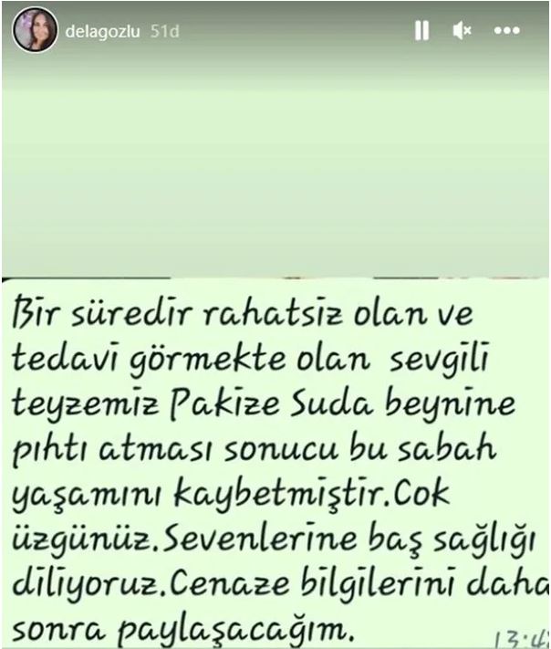 Dilara Elagözlü, sosyal medya paylaşımında "Bir süredir rahatsız olan ve tedavi görmekte olan sevgili teyzemiz Pakize Suda beynine pıhtı atması sonucu bu sabah yaşamını kaybetmiştir. Çok üzgünüz. Sevenlerine baş sağlığı diliyoruz" ifadelerini kullandı.