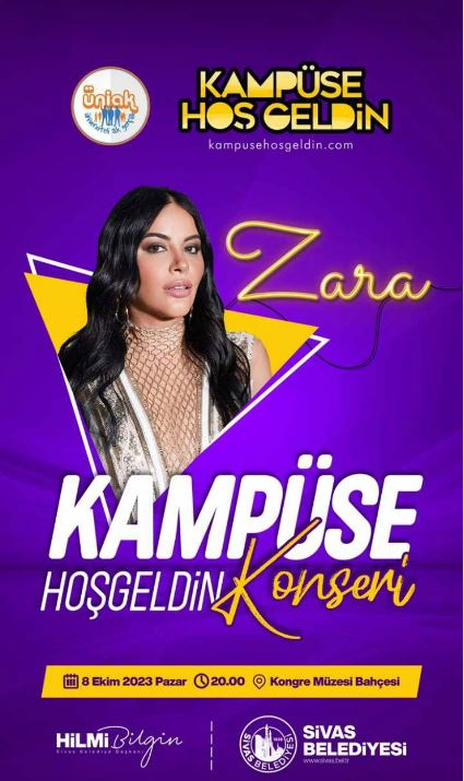 Sanatçı Zara 8 Ekim Pazar günü saat 20:00'de Kongre Müzesi Bahçesinde "Kampüse Hoş Geldin" konserinde Sivaslılarla buluşacak.