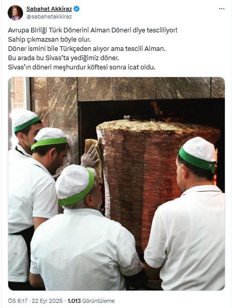 "Avrupa Birliği Türk dönerini Alman döneri diye tescilliyor! Sahip çıkmazsan böyle olur. Döner ismini bile Türkçeden alıyor ama tescili Alman. Bu arada bu Sivas’ta yediğimiz döner. Sivas’ın döneri meşhurdur, köftesi sonra icat oldu."