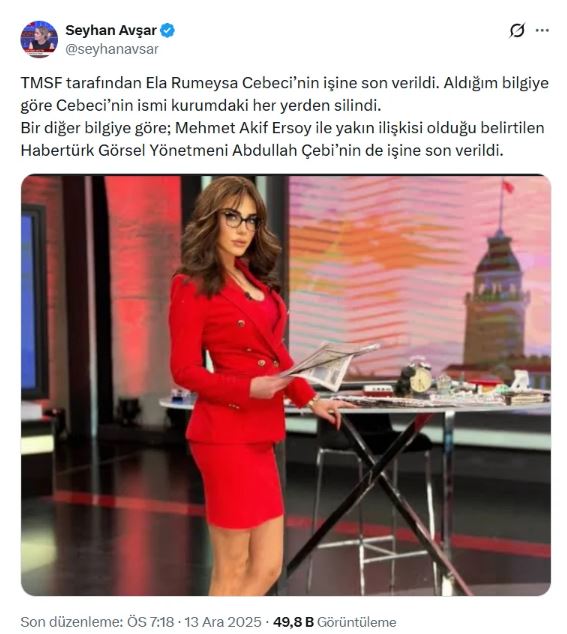 Gazeteci Seyhan Avşar’ın sosyal medya paylaşımına göre, Habertürk spikerlerinden Ela Rumeysa Cebeci’nin işine son verildi. Aynı paylaşımda, Mehmet Akif Ersoy ile yakın ilişkisi olduğu iddia edilen Habertürk Görsel Yönetmeni Abdullah Çebi’nin de görevden alındığı ileri sürüldü.