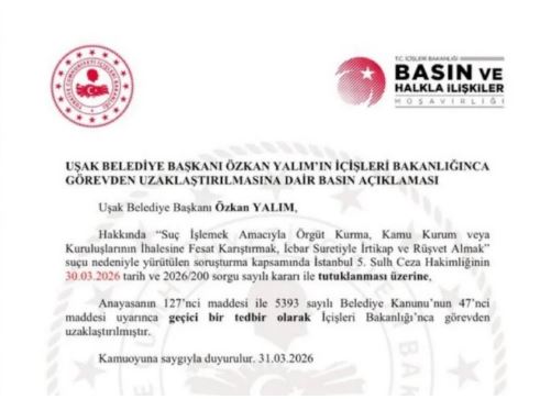 Tutuklama kararının ardından İçişleri Bakanlığı tarafından yapılan açıklamada, Yalım’ın görevinden uzaklaştırıldığı bildirildi. Uşak Belediye Meclisi’nde, valilik tarafından belirlenecek tarihte belediye başkanvekili seçimi yapılacağı öğrenildi.