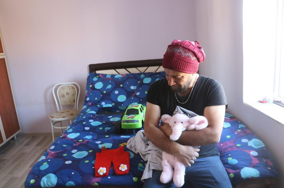 Gözü yaşlı baba güvenliklerinden endişe ettiği çocuklarının geride kalan oyuncaklarına sarılarak hasret gideriyor. iha