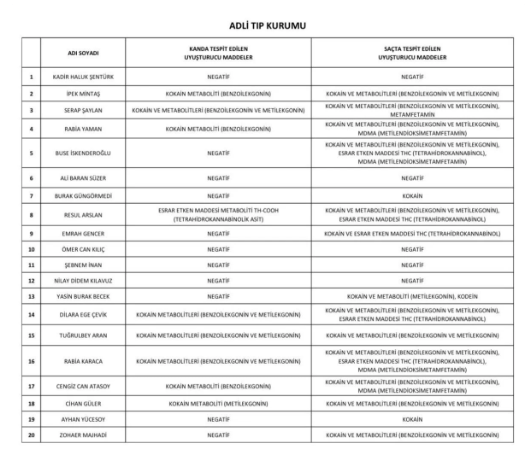 CNN Türk muhabiri Merve Tokaz’ın aktardığı bilgilere göre, şüphelilerin bir kısmında kan testleri negatif çıkmasına rağmen saç analizlerinde uyuşturucu madde ve metabolitlerine rastlanması dikkat çekti. Özellikle saç örneklerinde kokain ve metabolitleri (benzoilekgonin, metilekgonin), esrar etken maddesi THC ve bazı isimlerde MDMA (metilendioksimetamfetamin) tespit edildi.