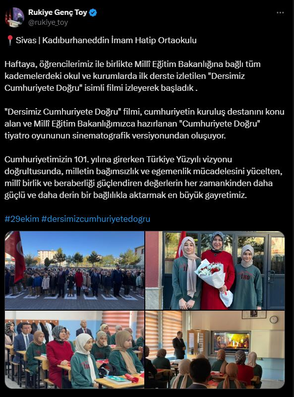 Sivas Kadıburhaneddin İmam Hatip Ortaokulu, bu haftaya Cumhuriyetimizin 101. yılına girerken, Millî Eğitim Bakanlığı tarafından hazırlanan "Dersimiz Cumhuriyete Doğru" filmi ile başladı.