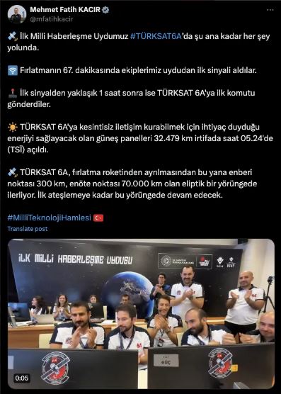 Kacır, sosyal medya hesabından, uzaya fırlatılan Türksat 6A'nın son durumuna ilişkin paylaşım yaptı. İlk milli haberleşme uydusu Türksat 6A'da şu ana kadar her şey yolunda olduğuna işaret eden Kacır, fırlatmanın 67. dakikasında ekiplerin uydudan ilk sinyali aldığını anımsattı.