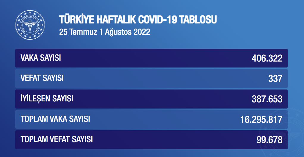Sağlık Bakanlığı, haftalık olarak açıkladığı verileri yayınladı. Geçen hafta 25 Temmuz – 1 Ağustos aralığında 406 bin 322 kişinin testinin pozitif çıkarken, 337 kişinin ise yaşamını yitirdiği açıklandı.
