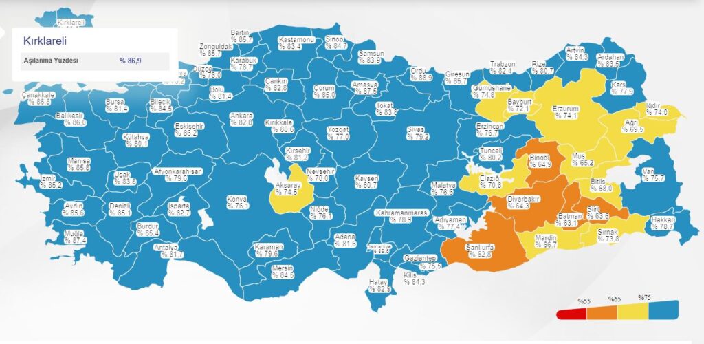 Sivas’ta en az iki doz aşı olmuş 18 yaş ve üstü nüfus oranı ise yüzde 79.2 oldu. Haftalık Koronavirüs Tablosu "covid19.saglik.gov.tr" sitesinden açıklandı.