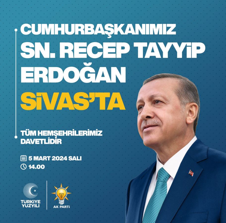 Daha öncede ilk olarak siz değerli okurlarımıza 25.02.2024 tarihinde "Cumhurbaşkanı Erdoğan Sivas’a Geliyor!" başlıklı haberimizde duyurduğumuz gibi Cumhurbaşkanı Erdoğan 5 Mart 2024 tarihinde Sivas'a geliyor.