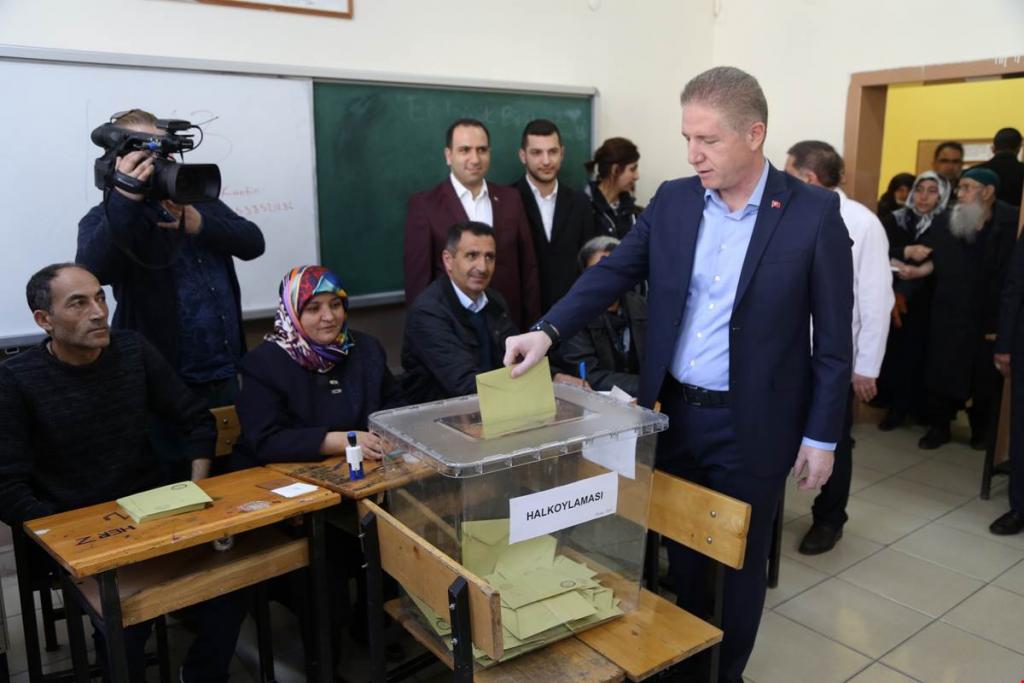 Vali Davut Gül ve eşi Gülden Gül seçmenlerle sıraya girerek oylarını 1013 nolu sandıkta kullandı.