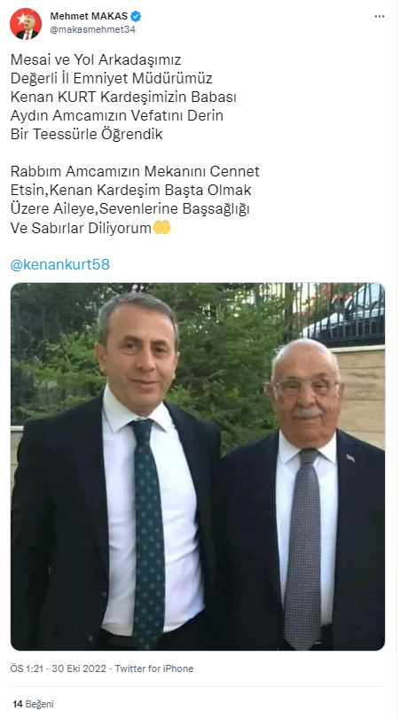 Erzincan Valisi Mehmet Makas sosyal medya hesabından yaptığı açıklamada :"Mesai ve Yol Arkadaşımız Değerli İl Emniyet Müdürümüz Kenan KURT Kardeşimizin Babası Aydın Amcamızın Vefatını Derin Bir Teessürle Öğrendik. Rabbım Amcamızın Mekanını Cennet Etsin, Kenan Kardeşim Başta Olmak Üzere Aileye, Sevenlerine Başsağlığı Ve Sabırlar Diliyorum." ifadelerine yer verdi.