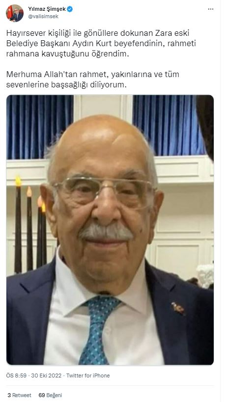 Sivas Valisi Yılmaz Şimşek hayatını kaybeden Zara önceki dönem Belediye Başkanı Aydın Kurt ile ilgili paylaşım yaptı.