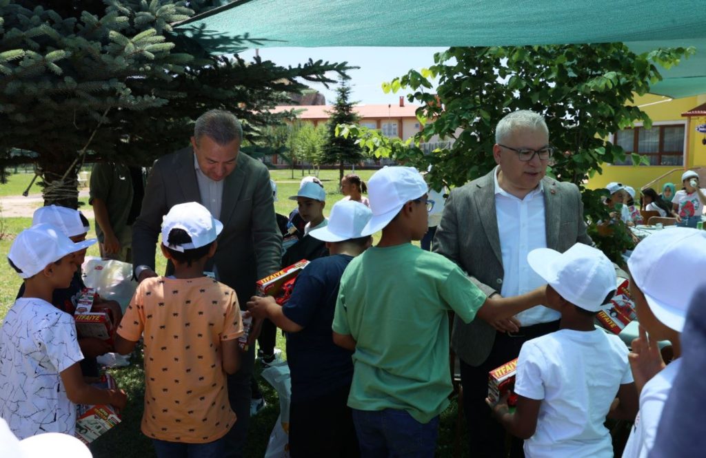 Çocuklarla ilgilenen Vali Şimşek ve Başkan Uzun çocuklara çeşitli hediyeler verdi.