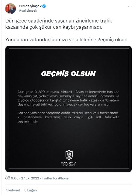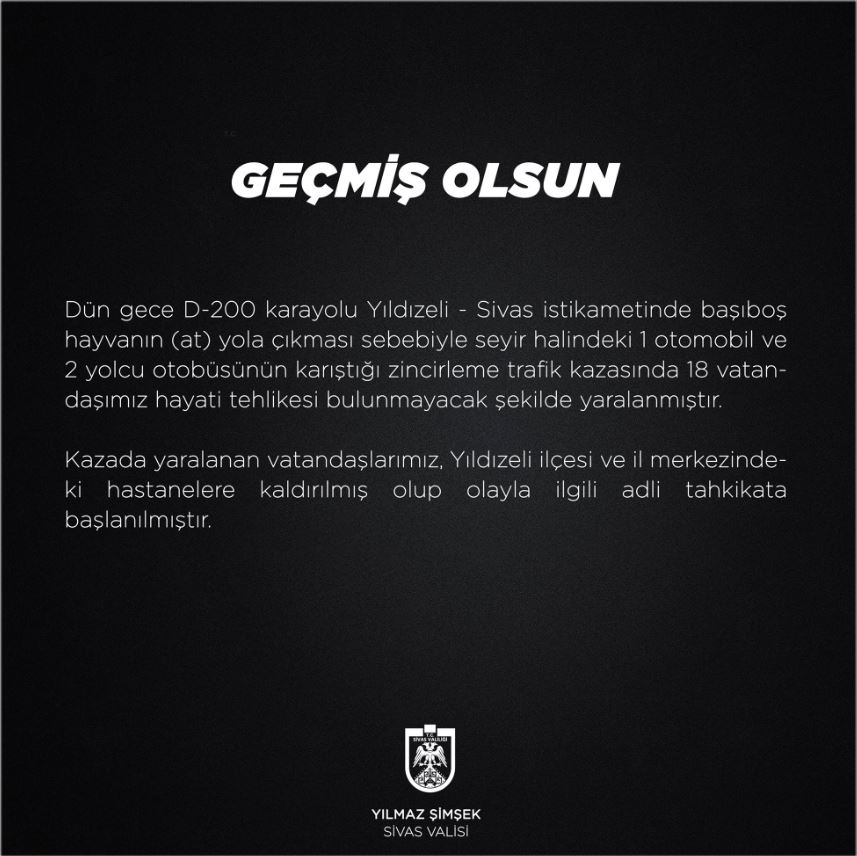 Kaza ile ilgili Sivas Valisi Yılmaz Şimşek sosyal medya hesabından açıklama yaptı.